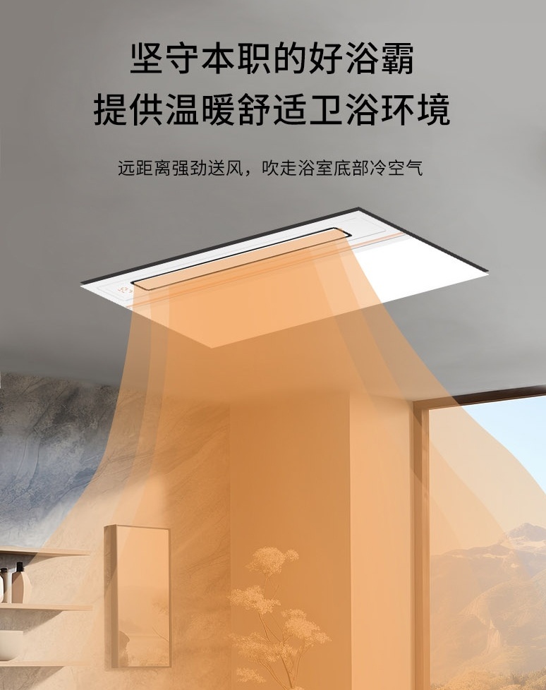 【120度瀑布擺風,溫暖均勻覆蓋】 120度的瀑布擺風設計,360°環(huán)繞進風,送風距離可達3m,立體循環(huán)加熱,廣域出風不直吹。確保了暖風能夠均勻覆蓋浴室的每一個角落,避免直吹帶來的不適,讓每一寸空間都充滿溫暖。