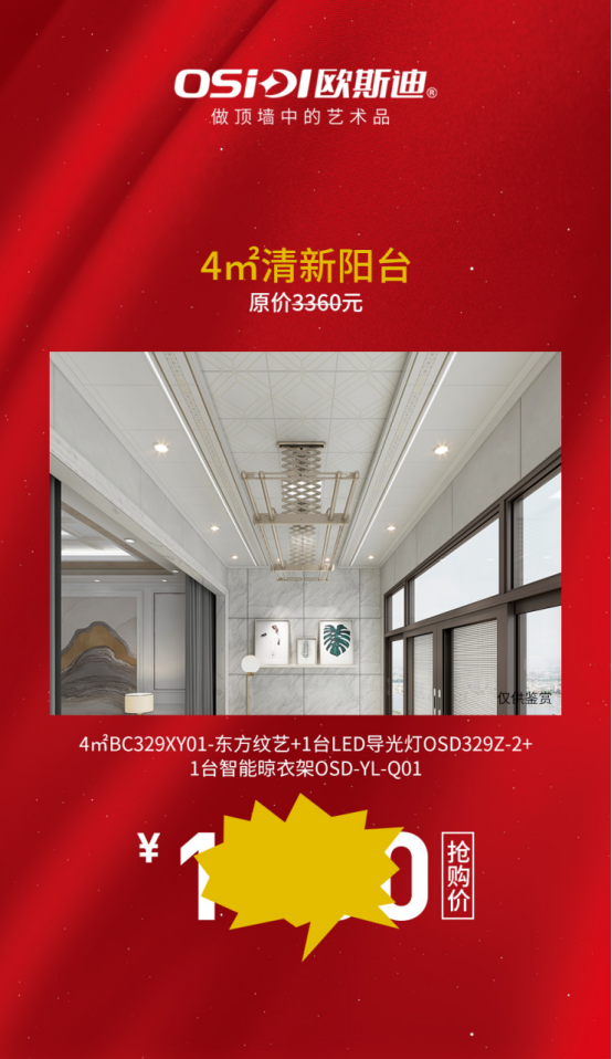 4㎡清新陽臺:4㎡BC329XY01-東方紋藝+1臺LED導光燈OSD329Z-2+1臺智能晾衣架OSD-YL-Q01